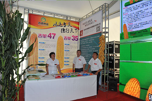 玉米產業博覽會有七個展區,有書畫筆會展區、玉米全株產業鏈圖片展區、種植業結構調整展區、農村電商展區、玉米全株產業鏈產品展示交易區、玉米種子展區、畜牧業展區。我公司在玉米全株產業鏈圖片展區重點展示了吉單27、吉單522、吉單35、吉單519、吉單505等獲得過國家或省里重大科技獎勵的品種。玉米種子展區中有主銷玉米品種的資料宣傳,重點展示了公司的吉單558、吉單50、吉單66、吉單47、吉單35等新品種;LED大屏幕宣傳公司的整體形象;在東側的主通道上有新品種種植區,重點展示了公司即將推出的新品種,吉單1402、吉單84、吉單96、吉單510等。