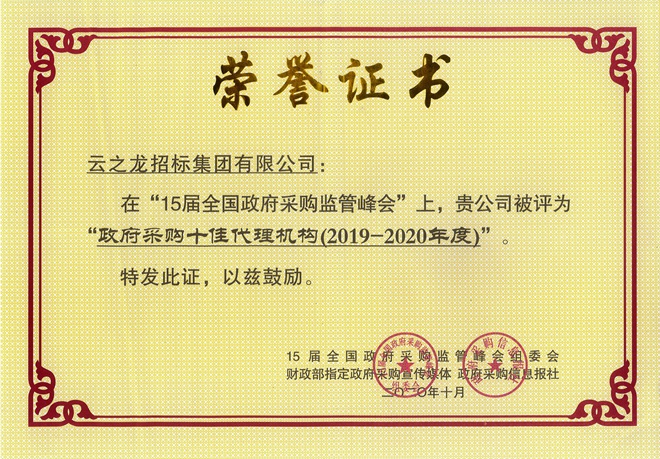 【喜訊】熱烈祝賀云之龍集團榮獲“全國政府采購十佳代理機構(2019-2020年度)”稱號