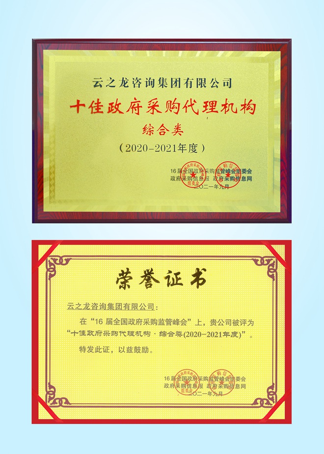 2021年9月28日,從16屆全國政府采購監管峰會上獲悉,云之龍咨詢集團再度榮獲全國“十佳政府采購代理機構”稱號,這是連續第二年獲此殊榮。