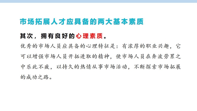 市場拓展人才專項(xiàng)培訓(xùn)則主要針對市場拓展人才應(yīng)具備的基本素質(zhì)和能力,市場拓展技巧,應(yīng)酬的七大黃金法則,如何更好地建立客戶管理體系。