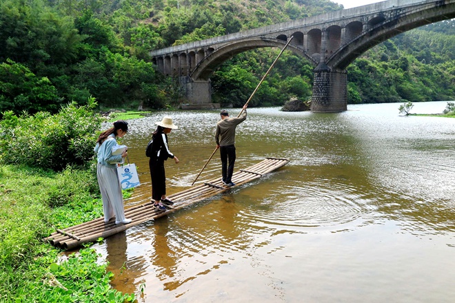 造價人員劃著小舟到橋下對欽北區板城鎮六屋江橋維修加固工程及貴臺鎮涼亭橋維修加固工程項目進行踏勘