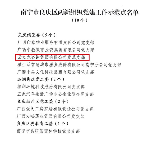 近日,中共南寧市良慶區(qū)委員會組織部、中共南寧市良慶區(qū)非公有制經(jīng)濟(jì)組織和社會組織工作委員會聯(lián)合發(fā)布了《關(guān)于公布南寧市良慶區(qū)兩新組織黨建工作示范點(diǎn)名單的通知》。云之龍黨總支部名列其中,榮獲“南寧市良慶區(qū)兩新組織黨建示范點(diǎn)”稱號。